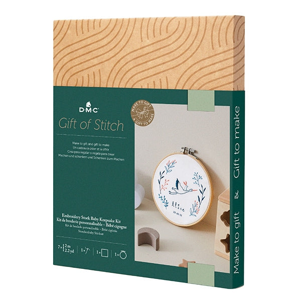 A kit that can embroider the stork and baby's name perfectly for childbirth celebration.