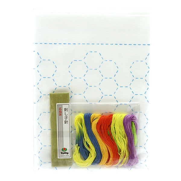 NeedleSashikoA kit with one needle, a thread, and a bleached cotton with a print that can be removed with water.