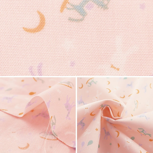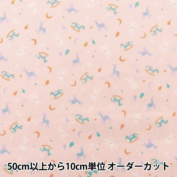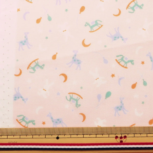 木馬やウサギなど、かわいいおもちゃがいっぱい並んだポップなデザインのブロード生地です。