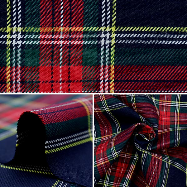 様々な幅のラインが格子になり、チェック柄が重なって形成された、タータンチェックの生地です。