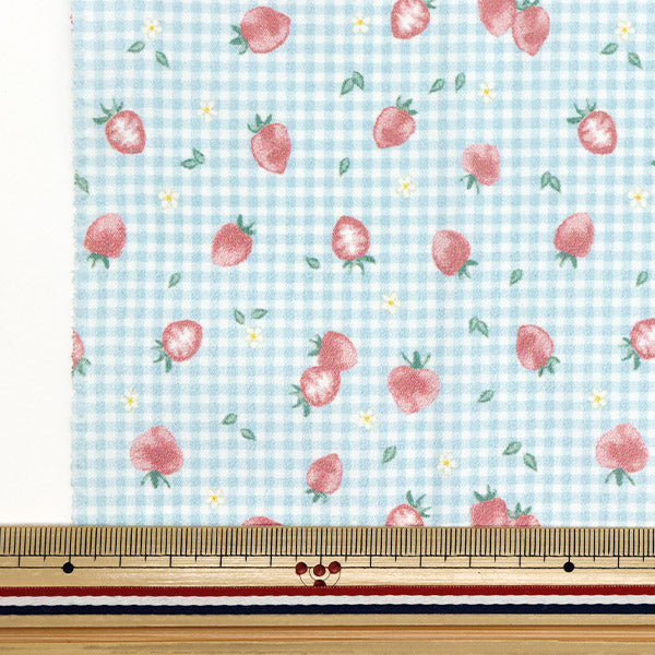 [はっ水加工 撥水加工 撥水生地 雨具 布 入園 入学 バッグ 袋物 苺 いちご 食べ物 果物 フルーツ 格子 水色]
