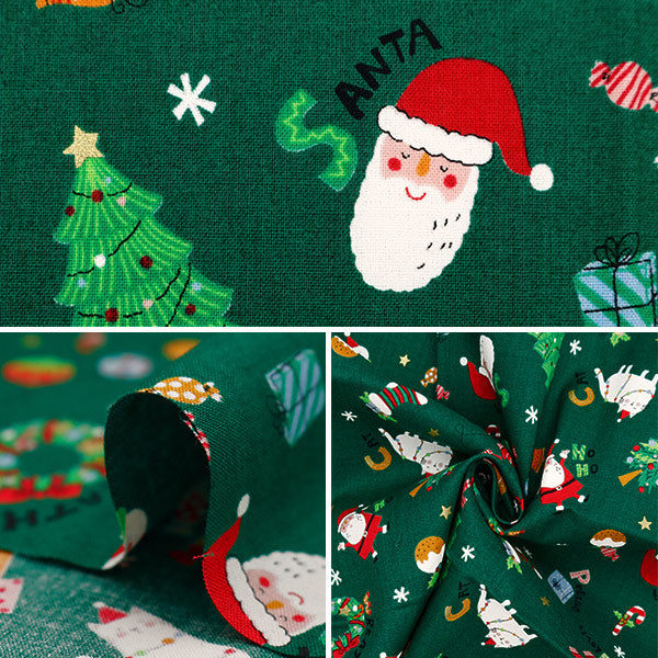 グリーン地にサンタクロースやクリスマスツリー、プレゼント、クリスマスプリント生地です。