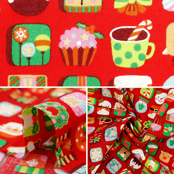 レッド地にブロックのサンタクロースやトナカイ、クリスマスツリーなどがプリントされた生地です。