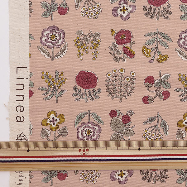 お花や苺、木の実などが並んだナチュラルな雰囲気のオックス生地です。