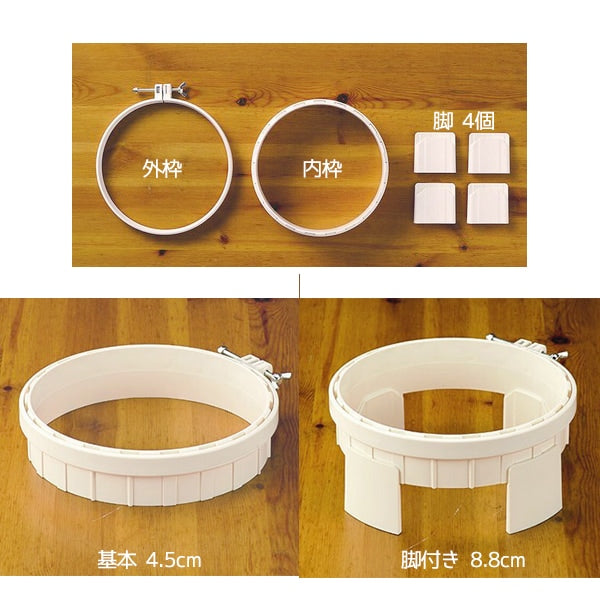 生地がずれにくく、高さ(4.5cm、8.8cm)が2段階に変えられるパンチニードルに適した刺しゅう枠です。